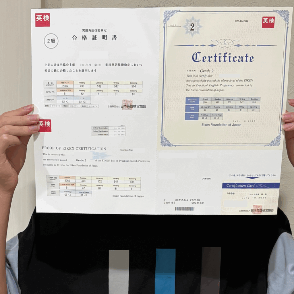 英検を受ける前とても不安でしたが、合否発表当日に結果確認をして、合格と書いてあるのを見て、とてもうれしく、今までやってきたことが正しかったということが実感できました。